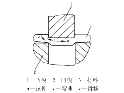 材料受壓力作用,開始滑移,材料內部產生拉伸力和彎曲力矩,由于間隙存在,靠近凸模下的材料彎曲變形大,開始出現(xiàn)剪斷。