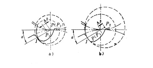 7、1956年蘇聯(lián)諾維柯夫(Novikov.M.L)提出并完成了圓弧圓柱齒輪,凸齒齒廓的圓心P在齒條型刀具的節(jié)線上,凹齒齒廓的圓弧半徑比凸齒齒廓的圓弧半徑大 p,其圓心P 在名義壓力角的半徑延長線上(圖1-3b)。輪齒的接觸是沿齒面的縱長方向運(yùn)動,接觸運(yùn)動速度和壓力角保持不變。